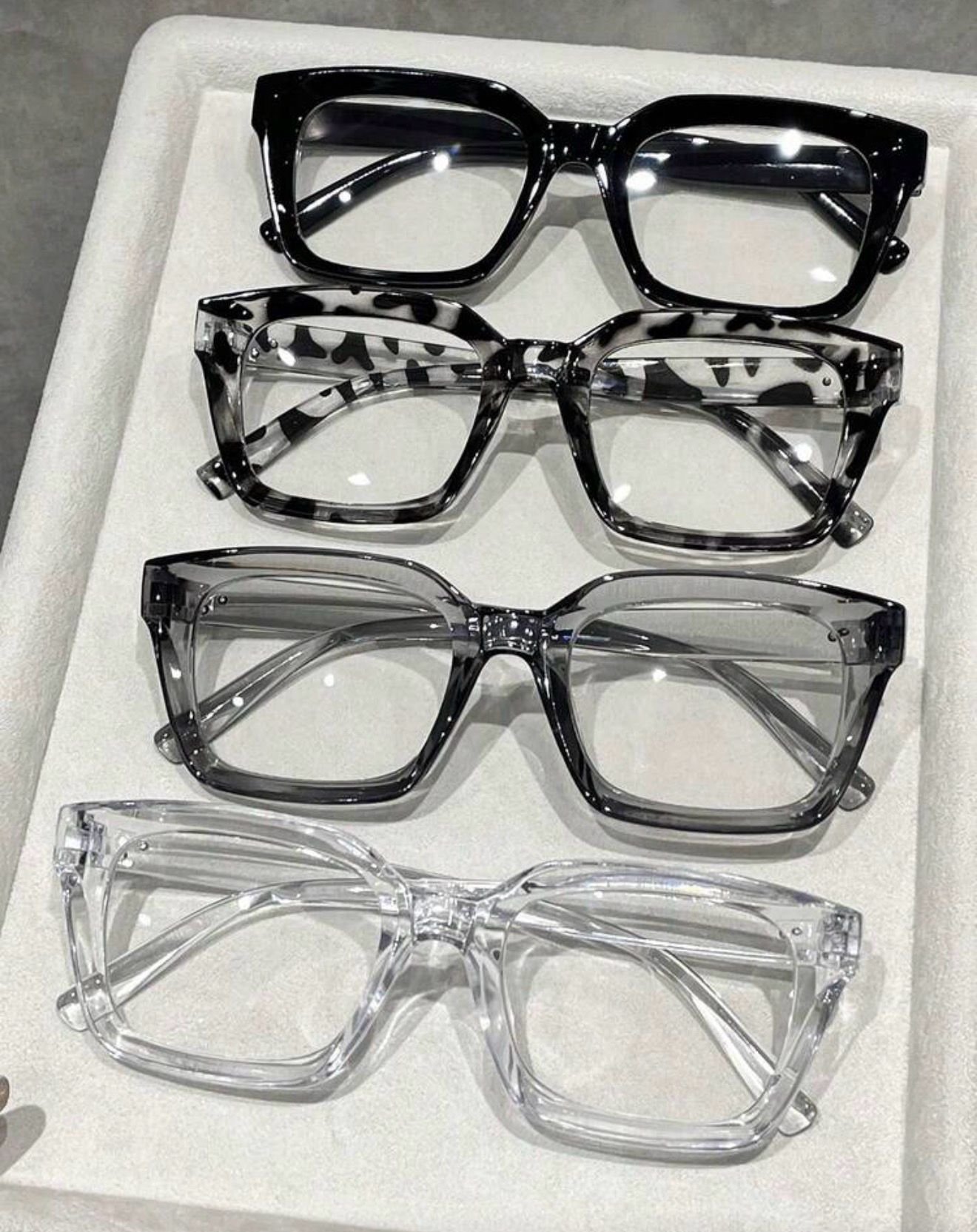 Set of four contemporary angular frames in clear crystal, black, cow print, and gradient gray-black. All equipped with anti-blue-light lenses. Ideal for those who love variety and edgy design.